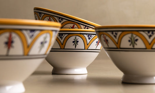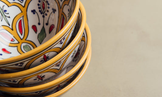 Marokkanische Keramik ist bekannt für ihre leuchtenden Farben und detailreichen Muster und vereint arabische, berberische und andalusische Einflüsse. Die dekorativen und zugleich funktionalen Stücke werden von erfahrenen Kunsthandwerkern von Hand gefertigt und zeichnen sich durch traditionelle Designs sowie besondere Glasurtechniken aus.