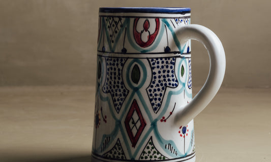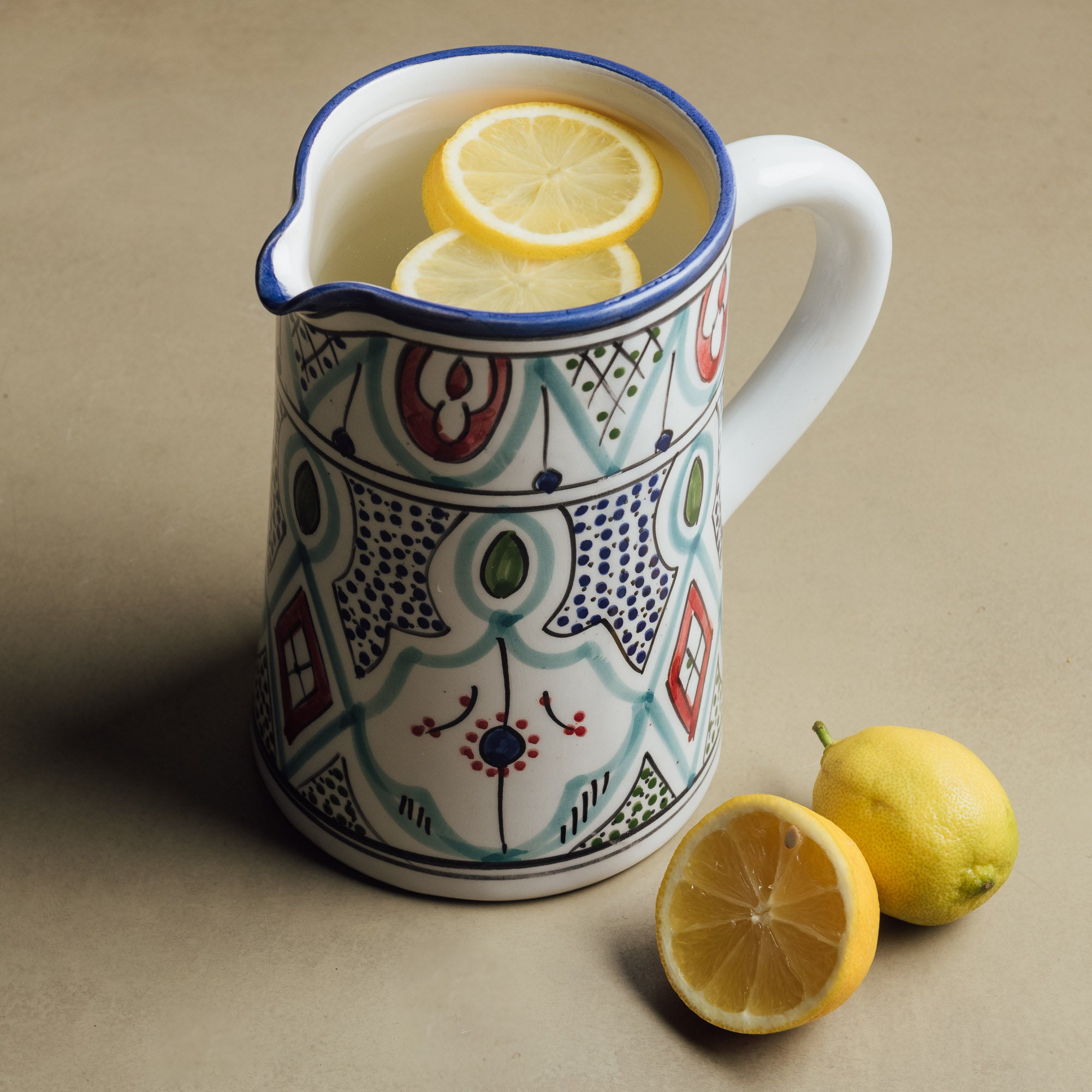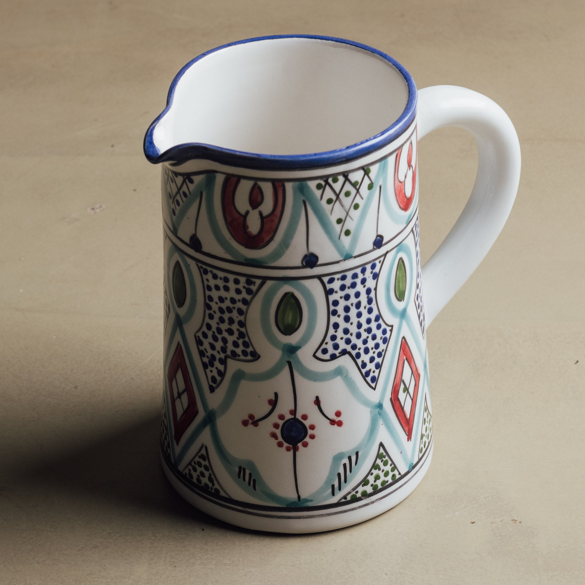 Handgefertigte Exzellenz: Jeder Krug wird in einem aufwendigen Verfahren sorgfältig von Hand gefertigt, das das Formen, das Handbemalen der Muster, das Glasieren und drei Brennvorgänge umfasst. Dieser sorgfältige Prozess kann bis zu 10 Tage dauern und gewährleistet eine außergewöhnliche Qualität, während er gleichzeitig die traditionelle marokkanische Handwerkskunst zur Geltung bringt.