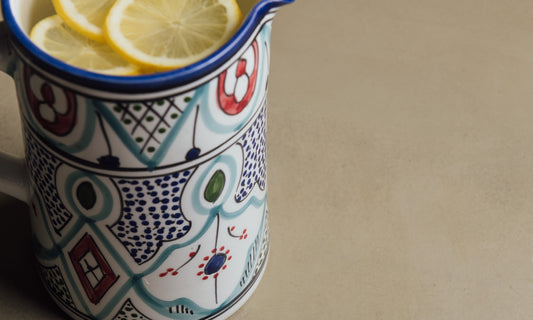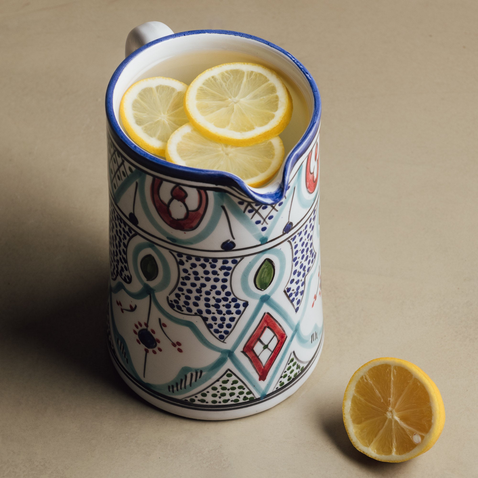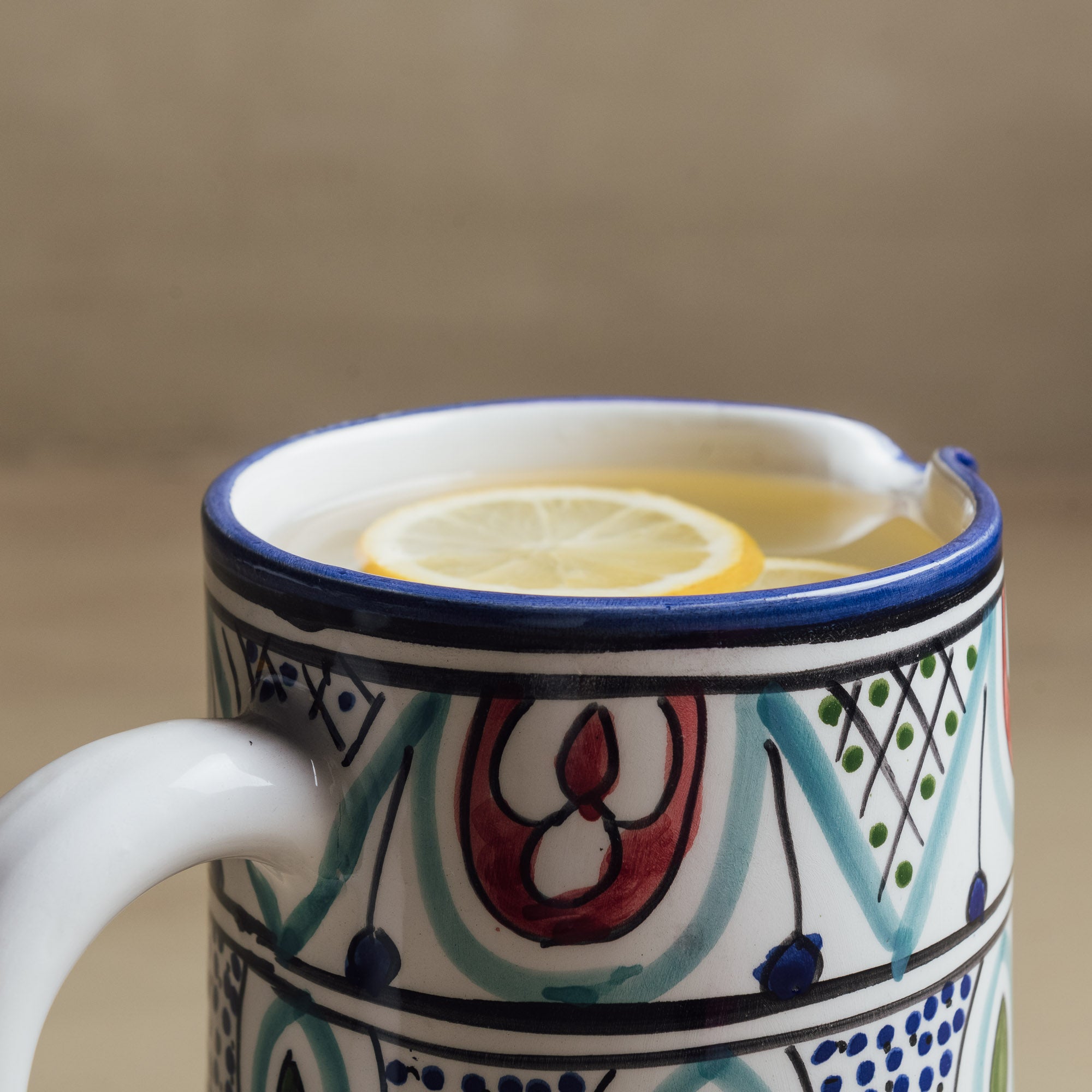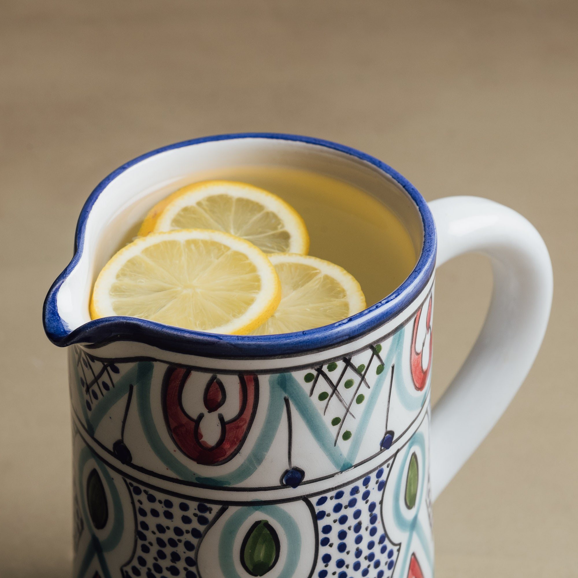 Handgefertigte Exzellenz: Jeder Krug wird in einem aufwendigen Verfahren sorgfältig von Hand gefertigt, das das Formen, das Handbemalen der Muster, das Glasieren und drei Brennvorgänge umfasst. Dieser sorgfältige Prozess kann bis zu 10 Tage dauern und gewährleistet eine außergewöhnliche Qualität, während er gleichzeitig die traditionelle marokkanische Handwerkskunst zur Geltung bringt.