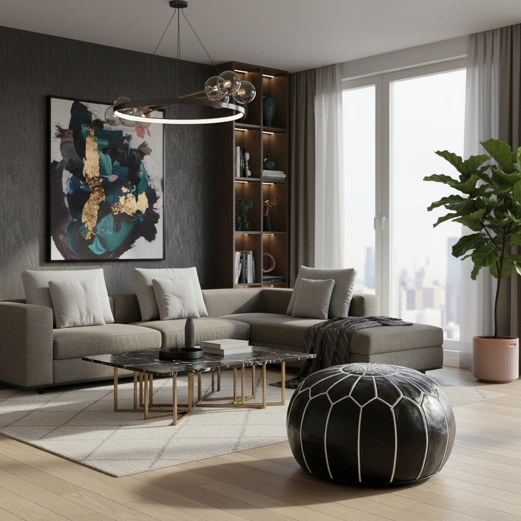 Lederpoufs haben in Marokko eine lange Geschichte, insbesondere in Fès, wo erfahrene Kunsthandwerker sie seit Jahrhunderten herstellen. Beim Färben kommen natürliche Farbstoffe wie Safran und Indigo zum Einsatz, die dem Leder seine leuchtenden Farbtöne verleihen. Anschließend wird das Leder von Hand zugeschnitten, genäht und bestickt – jedes Stück ein echtes Unikat.