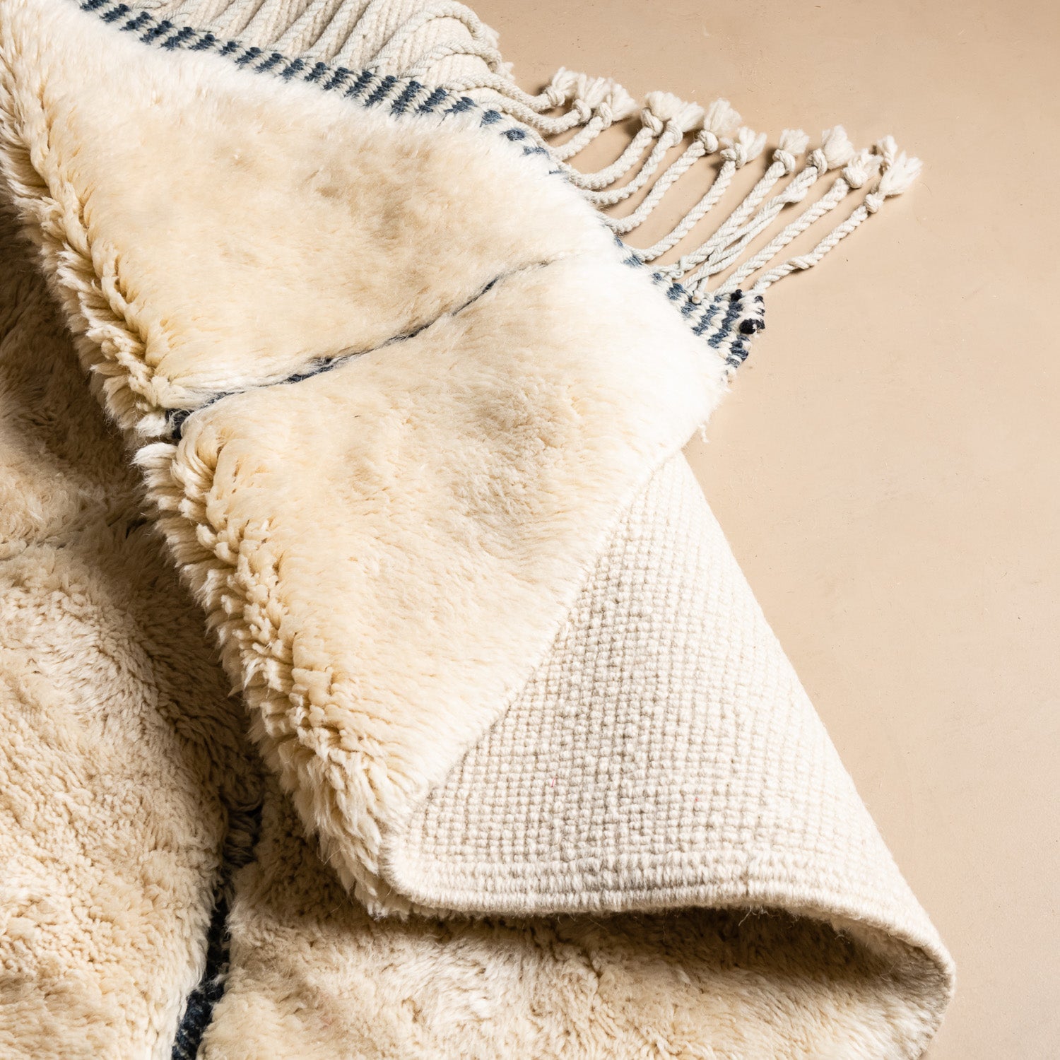 + Die Fransen werden traditionell auf einer Seite des Teppichs eingearbeitet.