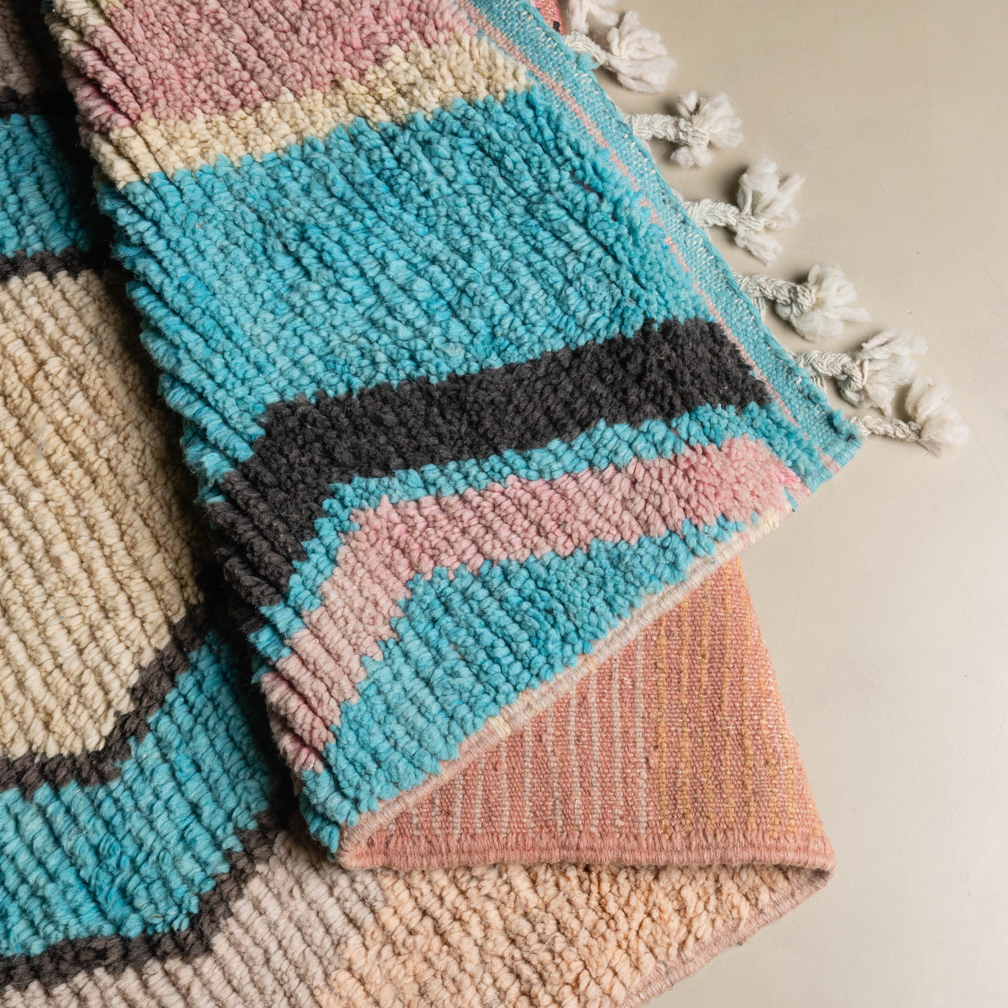 Boujad-Teppiche entstehen aus einem jahrhundertealten Wissen, das von den Frauen des Boujad-Stammes über Generationen weitergegeben wurde. Ihre farbenfrohen Muster sind von der Natur und den traditionellen Vorstellungen der Weberinnen inspiriert.