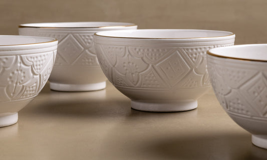 Verleihen Sie Ihrem Alltag einen Hauch marokkanischer Eleganz mit der weißen Zagora-Schale, die mit 12-Karat-Goldakzenten verziert ist. Diese Schale wurde von talentierten marokkanischen Kunsthandwerkern handgefertigt und zeichnet sich durch ein schlankes, zeitgemäßes Design aus, das ihr einen raffinierten, zeitlosen Look verleiht. Sie eignet sich perfekt für Suppen, Salate oder andere Gerichte Ihrer Wahl und verbindet authentische Handwerkskunst mit moderner Raffinesse.