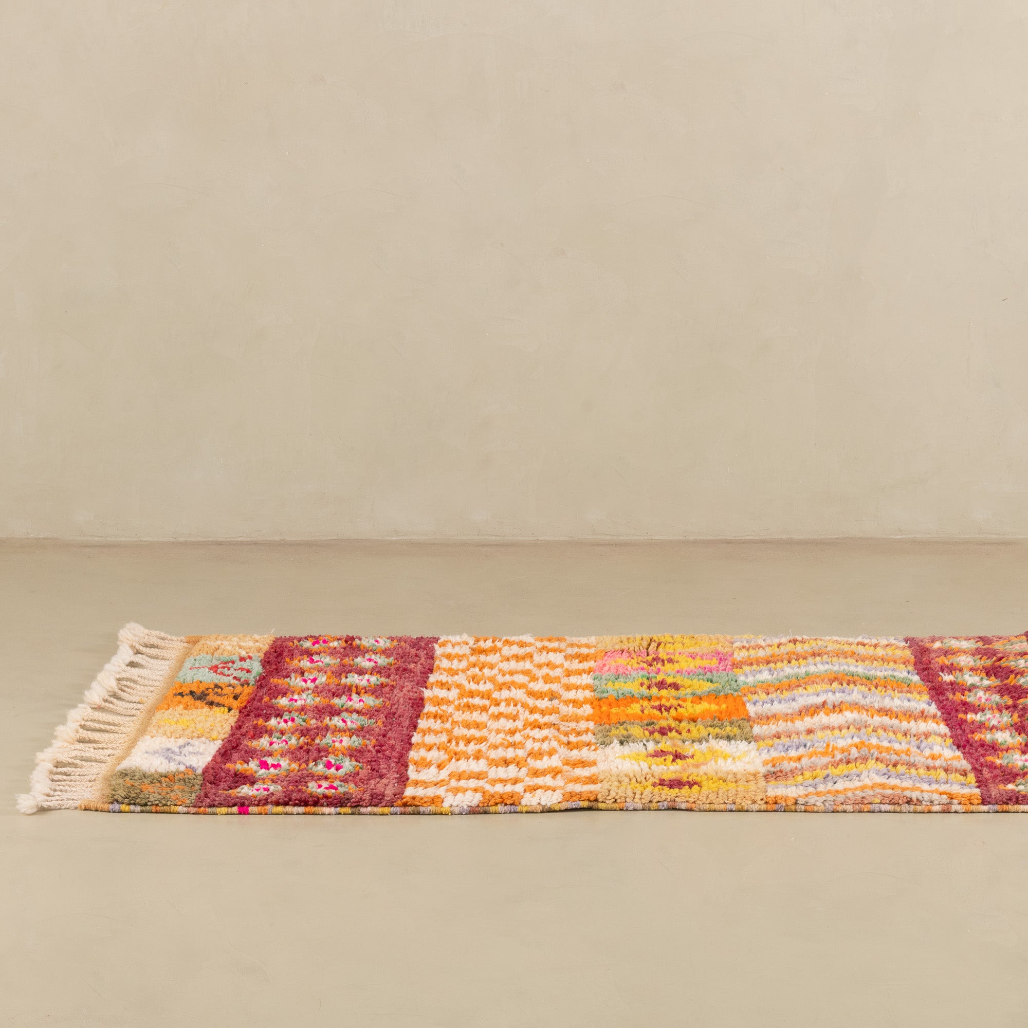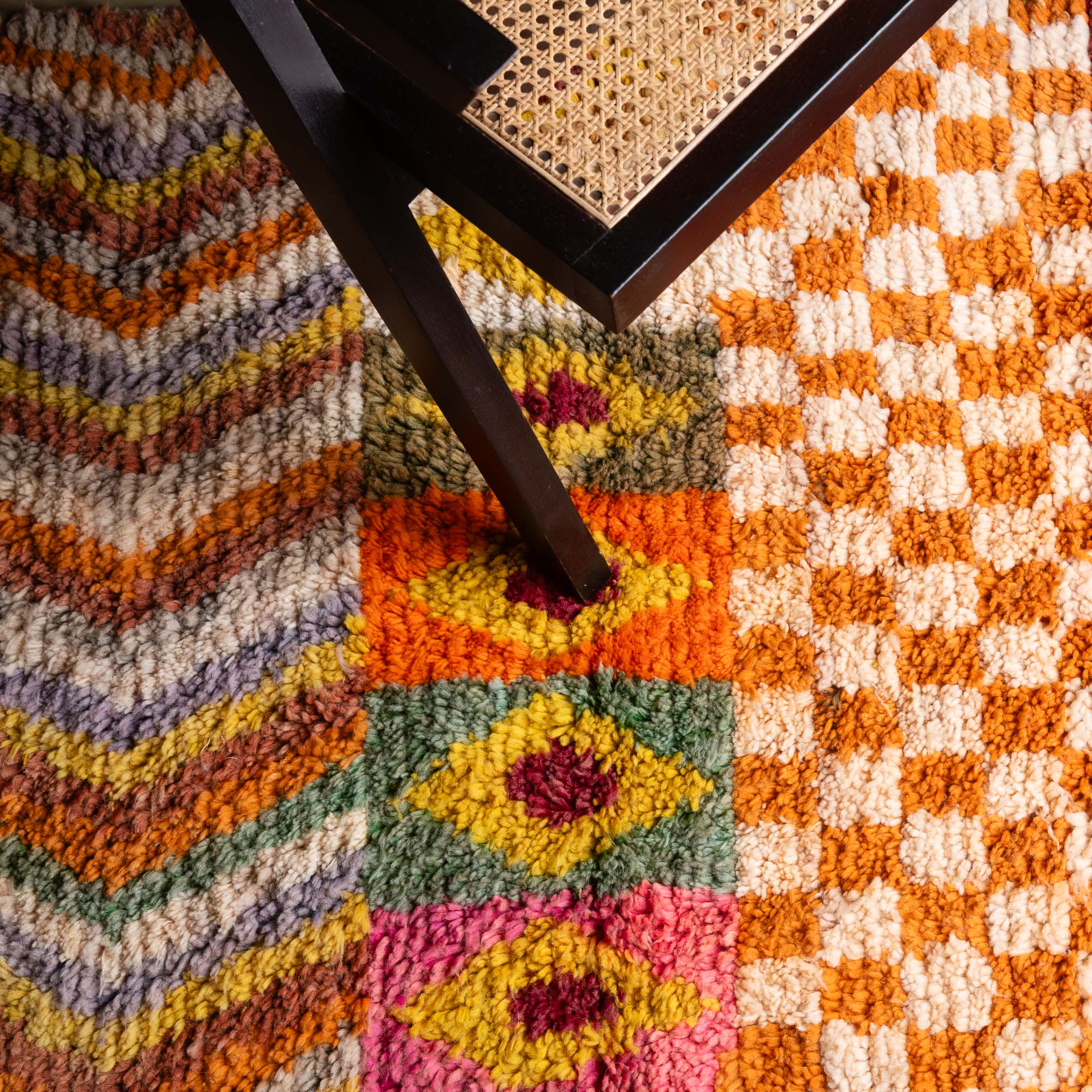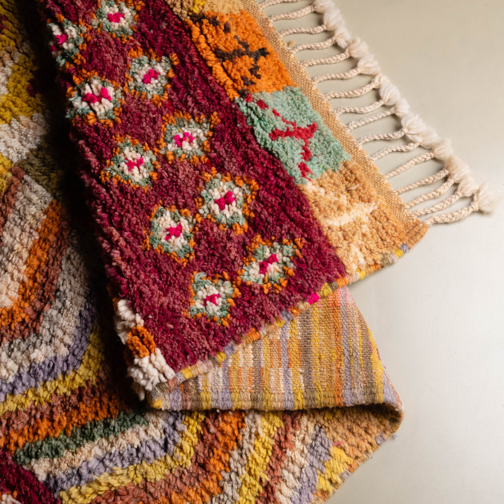 Boujad-Teppiche entstehen aus einem jahrhundertealten Wissen, das von den Frauen des Boujad-Stammes über Generationen weitergegeben wurde. Ihre farbenfrohen Muster sind von der Natur und den traditionellen Vorstellungen der Weberinnen inspiriert.