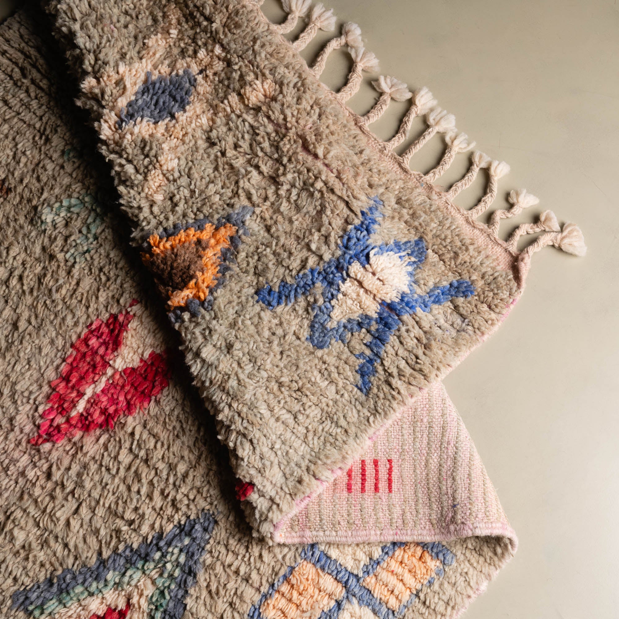 Boujad-Teppiche entstehen aus einem jahrhundertealten Wissen, das von den Frauen des Boujad-Stammes über Generationen weitergegeben wurde. Ihre farbenfrohen Muster sind von der Natur und den traditionellen Vorstellungen der Weberinnen inspiriert.