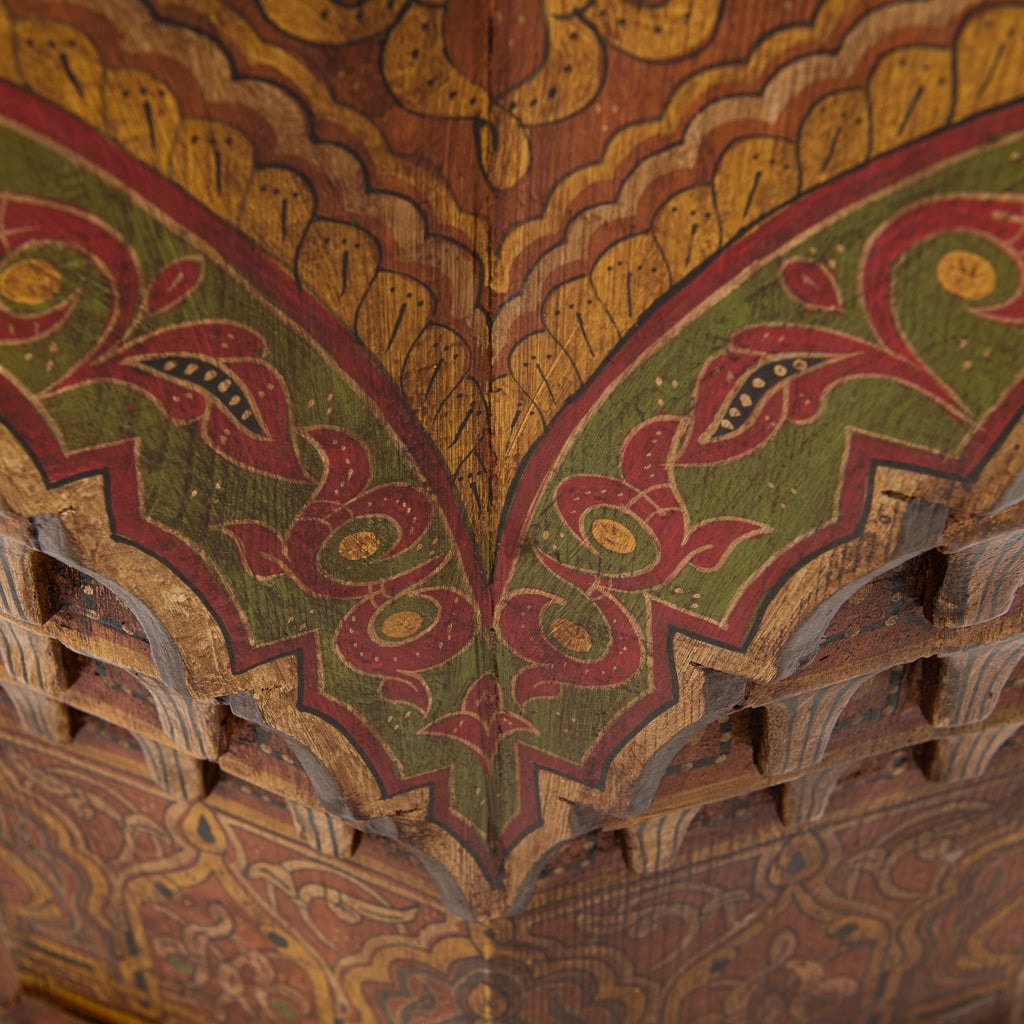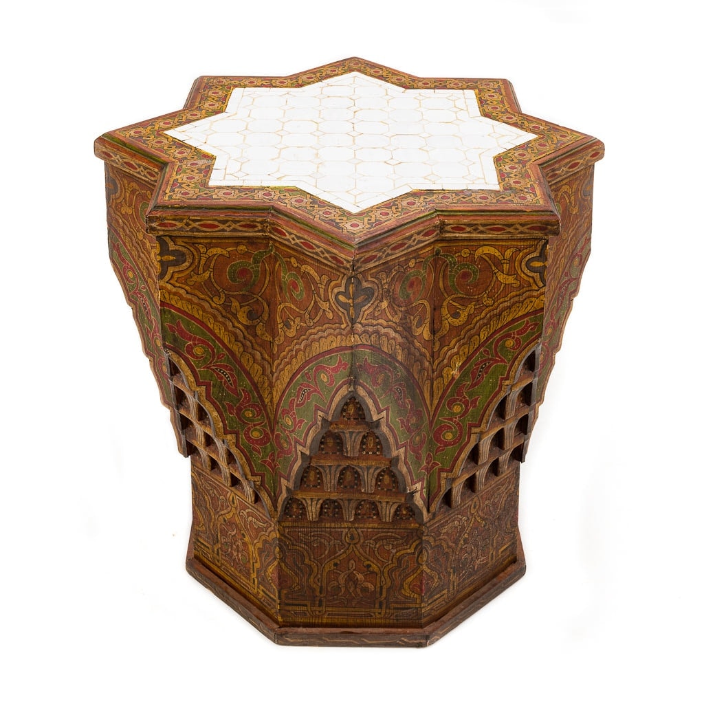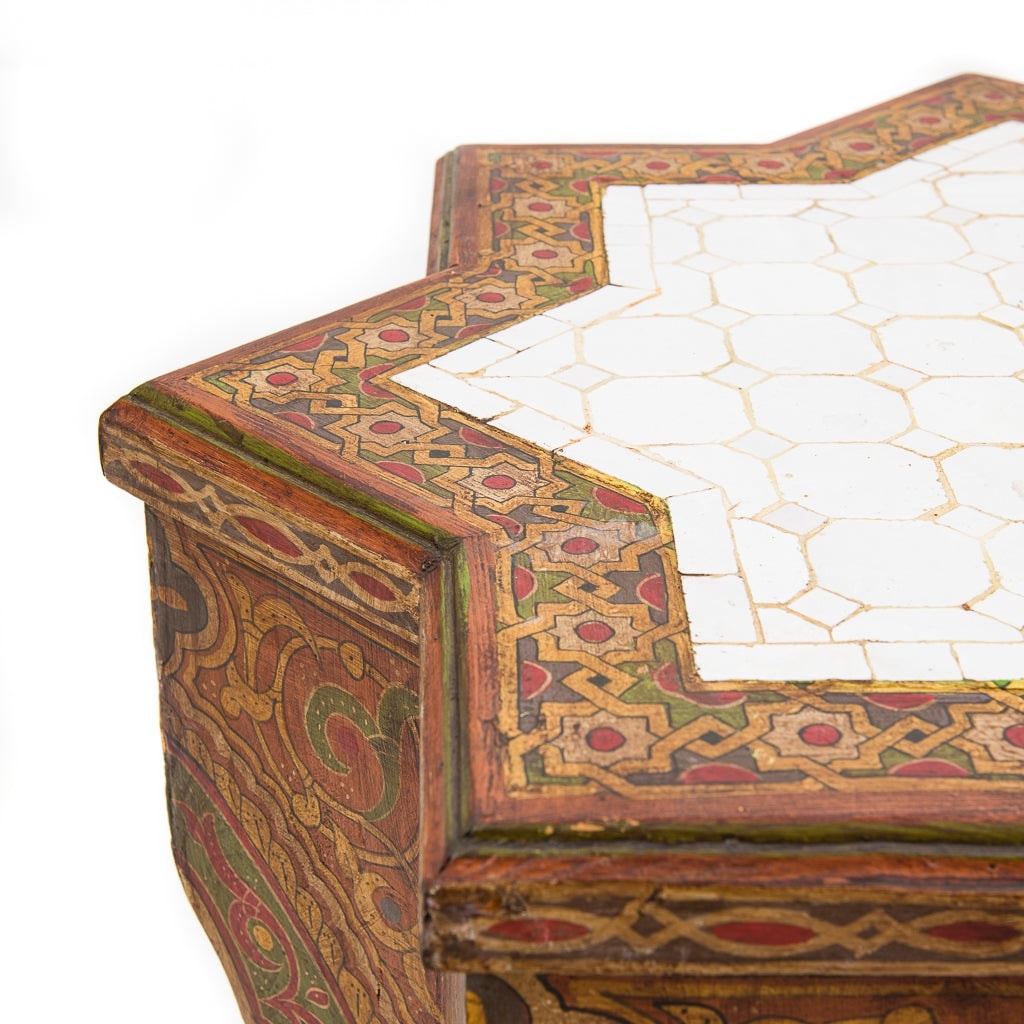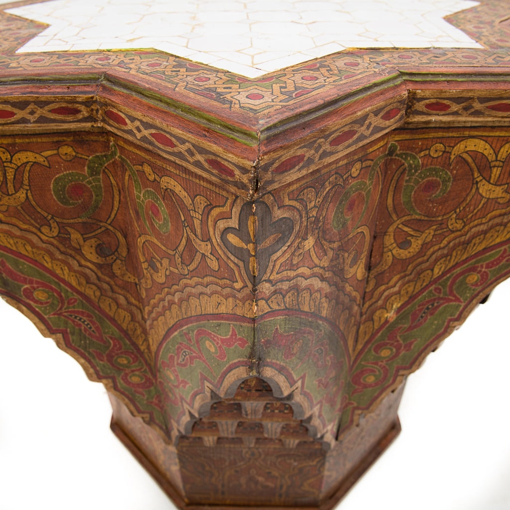 Unser authentischer marokkanischer Beistelltisch von exquisiter Schönheit ist vollständig aus Holz gefertigt und mit filigranen, handgemalten Schnitzereien in leuchtenden Farben verziert. Dieses antike Erbstück, das über die Jahre hinweg sorgfältig geschützt und gepflegt wurde, verkörpert die ganze Schönheit Marokkos. Stellen Sie sich dieses bezaubernde Kunstwerk als Herzstück Ihres Esszimmers, Wohnzimmers oder Schlafzimmers vor, das sich perfekt in ein formelles Ambiente oder ebenso makellos in eine ungezwungene Atmosphäre einfügt.
