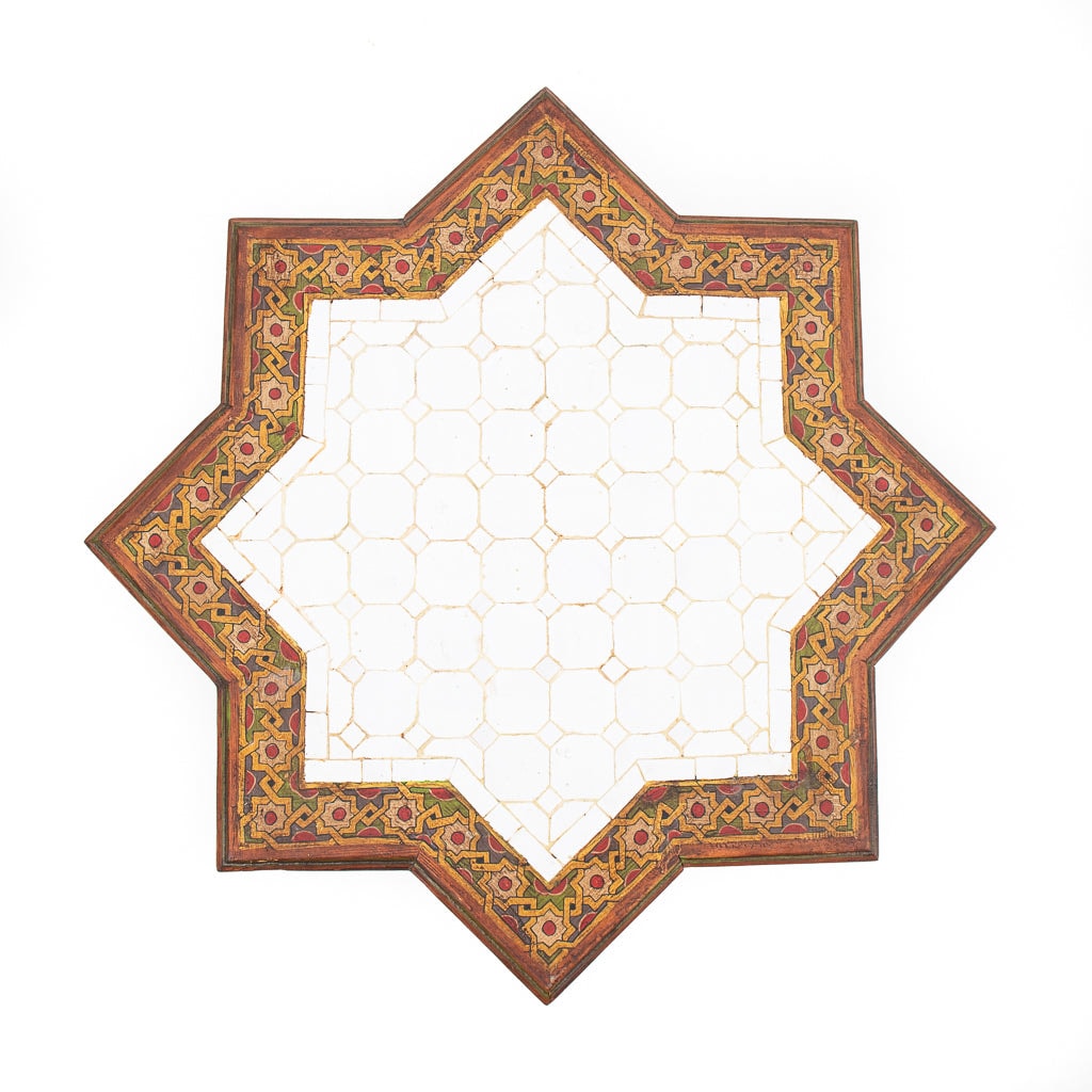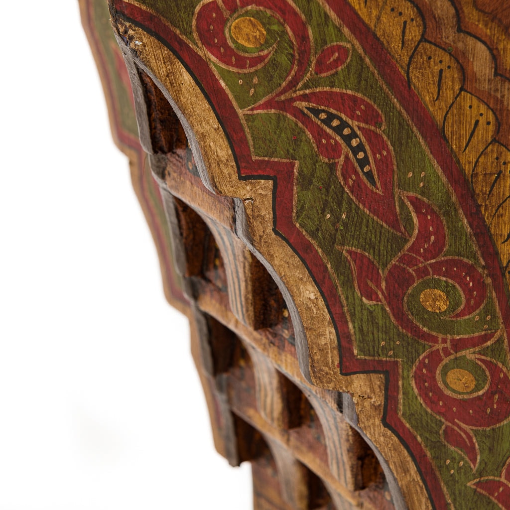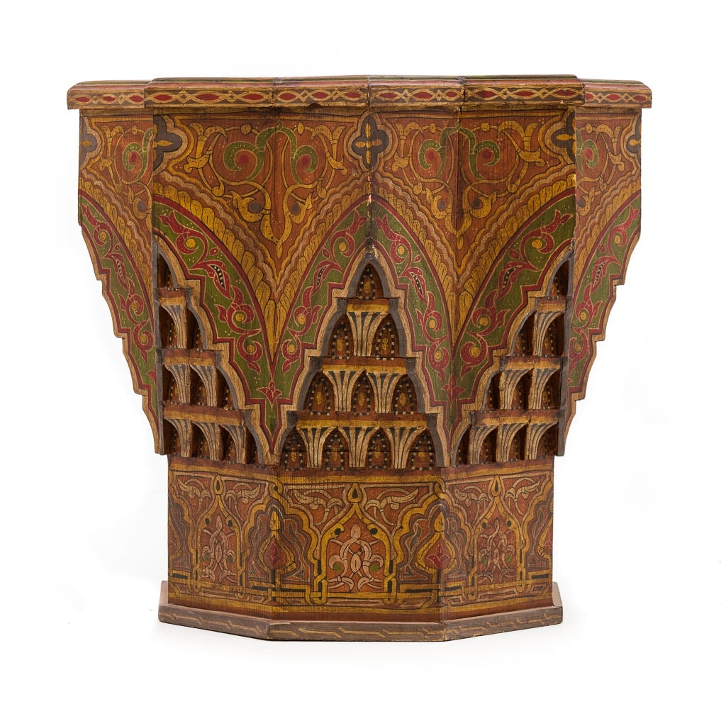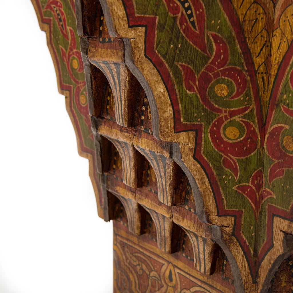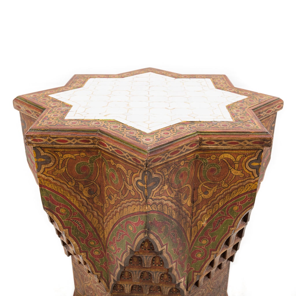 Unser authentischer marokkanischer Beistelltisch von exquisiter Schönheit ist vollständig aus Holz gefertigt und mit filigranen, handgemalten Schnitzereien in leuchtenden Farben verziert. Dieses antike Erbstück, das über die Jahre hinweg sorgfältig geschützt und gepflegt wurde, verkörpert die ganze Schönheit Marokkos. Stellen Sie sich dieses bezaubernde Kunstwerk als Herzstück Ihres Esszimmers, Wohnzimmers oder Schlafzimmers vor, das sich perfekt in ein formelles Ambiente oder ebenso makellos in eine ungezwungene Atmosphäre einfügt.