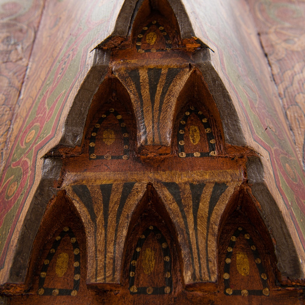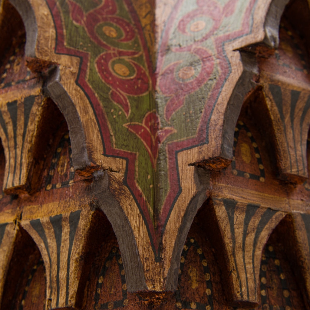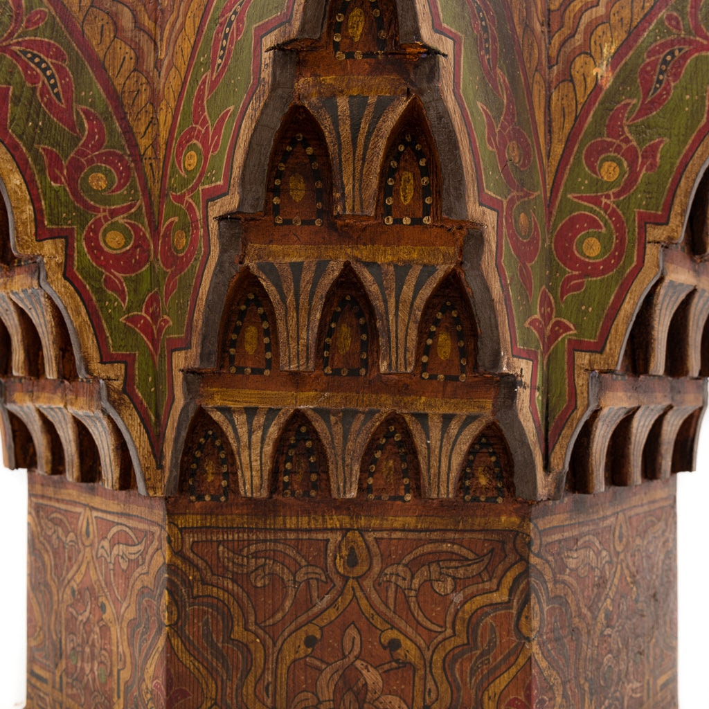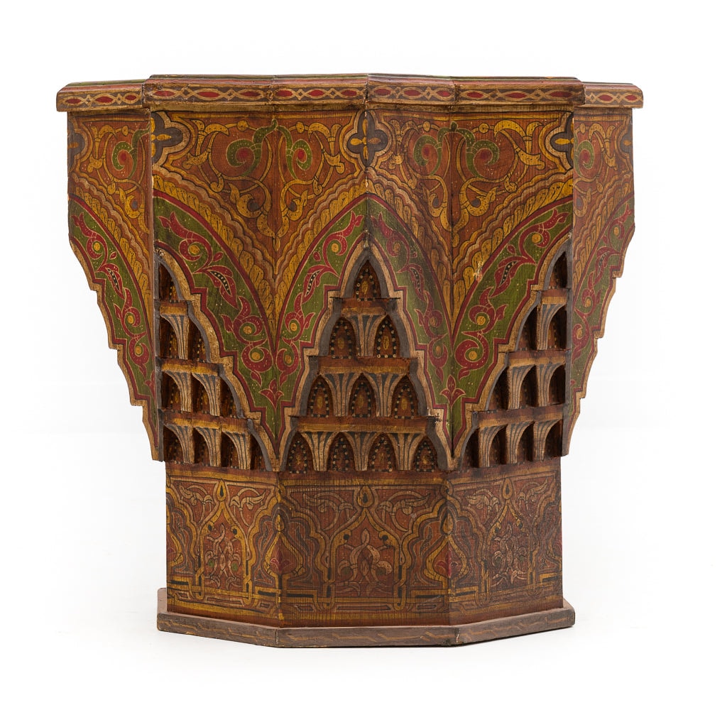Unser authentischer marokkanischer Beistelltisch von exquisiter Schönheit ist vollständig aus Holz gefertigt und mit filigranen, handgemalten Schnitzereien in leuchtenden Farben verziert. Dieses antike Erbstück, das über die Jahre hinweg sorgfältig geschützt und gepflegt wurde, verkörpert die ganze Schönheit Marokkos. Stellen Sie sich dieses bezaubernde Kunstwerk als Herzstück Ihres Esszimmers, Wohnzimmers oder Schlafzimmers vor, das sich perfekt in ein formelles Ambiente oder ebenso makellos in eine ungezwungene Atmosphäre einfügt.