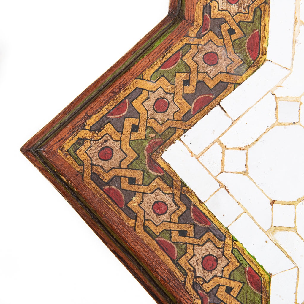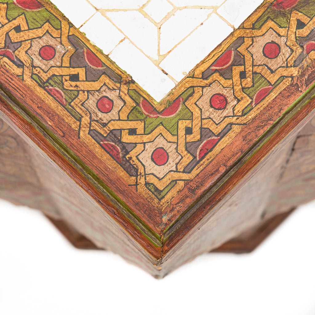 Antiker marokkanischer Beistelltisch. Aus geschnitztem Holz gefertigt, handbemalt und sorgfältig mit Zellige-Fliesen verkleidet.