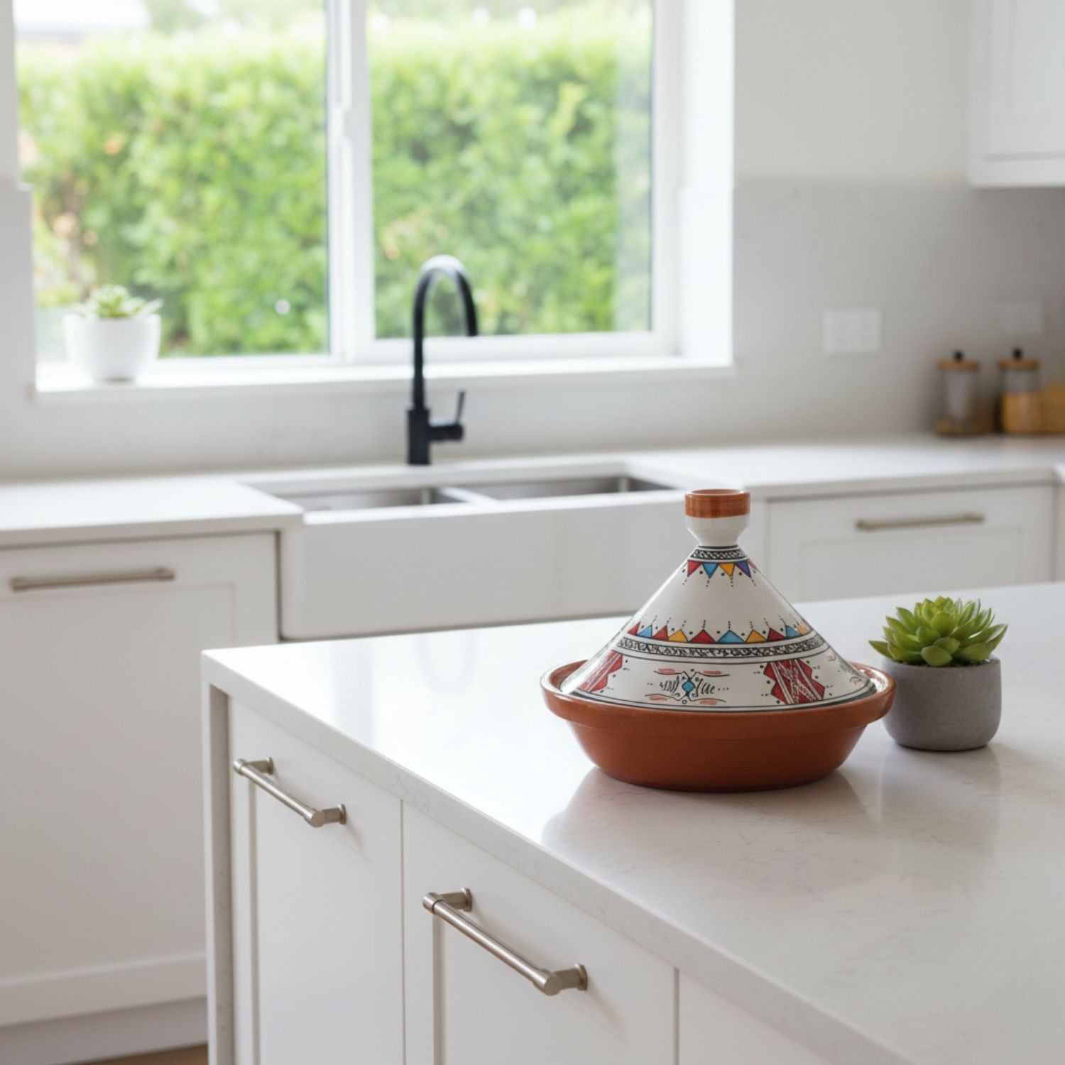 Vielseitig und stilvoll: Ob Sie eine schmackhafte marokkanische Tajine zubereiten oder sie als dekorativen Akzent in Ihrer Küche verwenden, dieses Stück ist sowohl praktisch als auch schön. Der charakteristische konische Deckel hilft dabei, Feuchtigkeit zu speichern, sodass Ihre Gerichte perfekt zart und aromatisch werden.