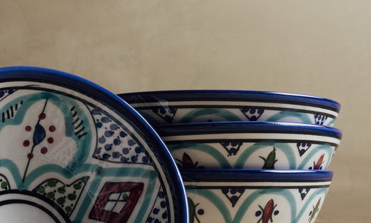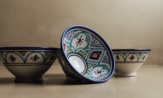 Marokkanische Keramik ist bekannt für ihre leuchtenden Farben und detailreichen Muster und vereint arabische, berberische und andalusische Einflüsse. Die dekorativen und zugleich funktionalen Stücke werden von erfahrenen Kunsthandwerkern von Hand gefertigt und zeichnen sich durch traditionelle Designs sowie besondere Glasurtechniken aus.