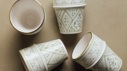 Verleihen Sie Ihren alltäglichen Momenten mit der Fez Green Cup einen Hauch marokkanischer Eleganz. Diese Tasse wurde von erfahrenen marokkanischen Kunsthandwerkern handgefertigt und zeichnet sich durch ein minimalistisches Design aus, das durch luxuriöse 12-Karat-Goldakzente für einen raffinierten, zeitlosen Look hervorgehoben wird. Sie eignet sich perfekt für Kaffee, Tee oder jedes andere Getränk Ihrer Wahl und vereint authentische Handwerkskunst mit moderner Raffinesse.