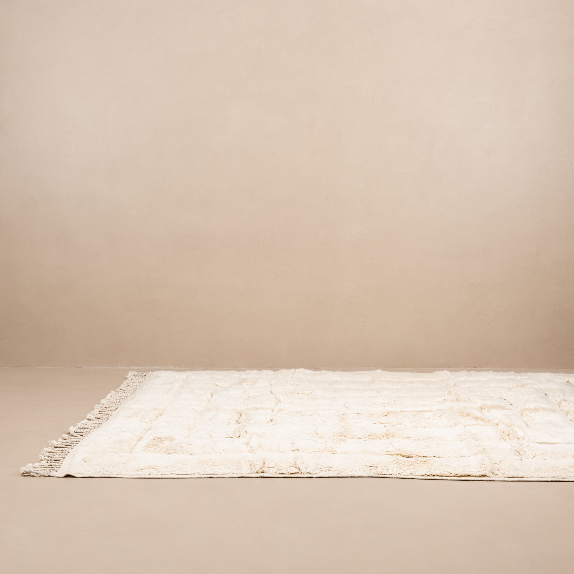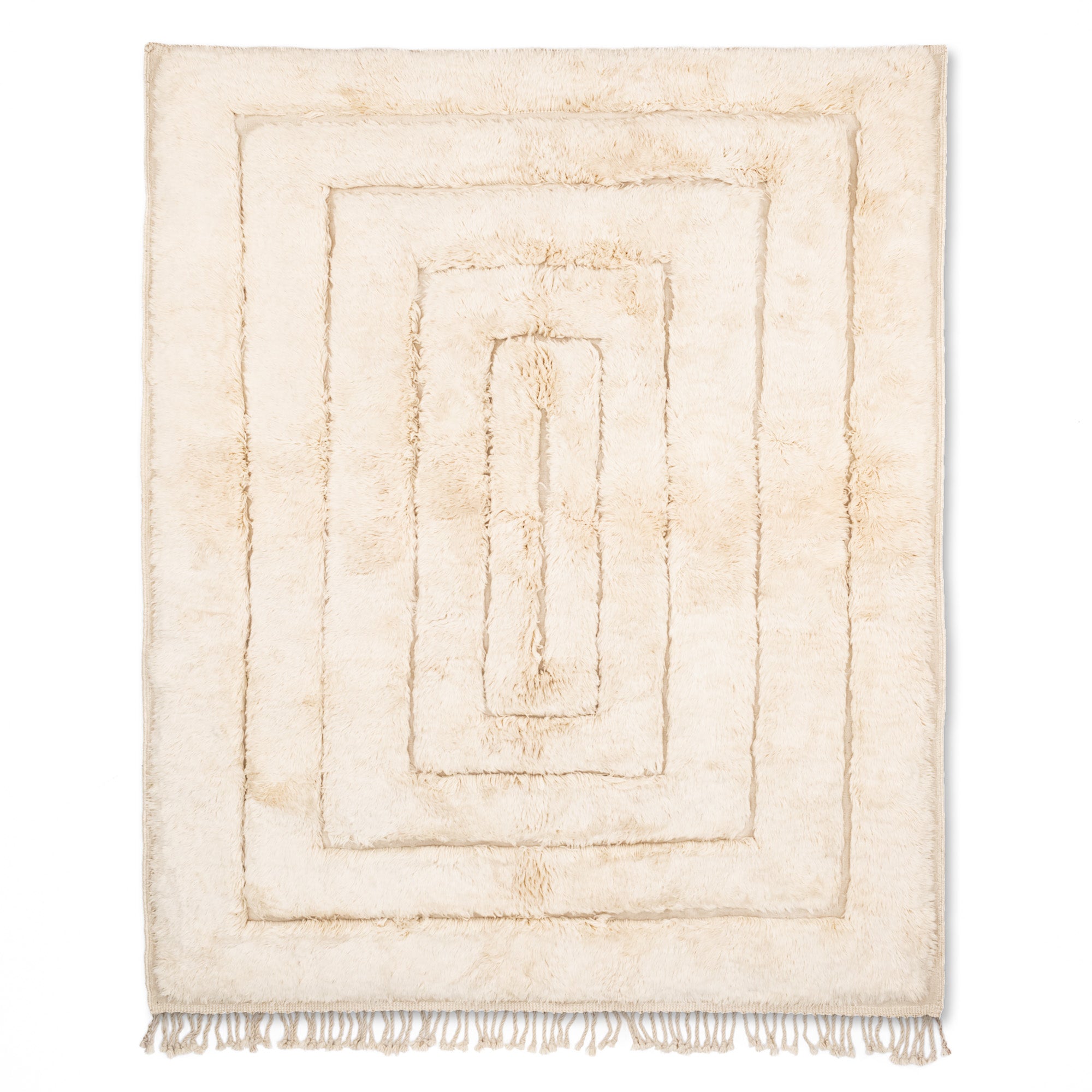 Dieser Teppich wurde von den talentiertesten Kunsthandwerkerinnen der Region Beni Mrirt von Hand gewebt. Sie bewahren das traditionelle Wissen ihres Stammes mit großer Sorgfalt und geben es seit Generationen weiter. Diese uralte Webtechnik, kombiniert mit hochwertiger, aus Australien importierter Wolle, ermöglicht die Herstellung von Teppichen, die zugleich kunstvoll und edel sind. Das Ergebnis ist ein einzigartiges Stück voller kultureller Tiefe, außergewöhnlicher Weichheit und zeitloser Schönheit.