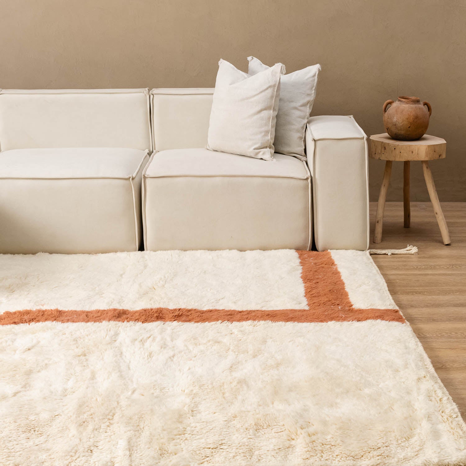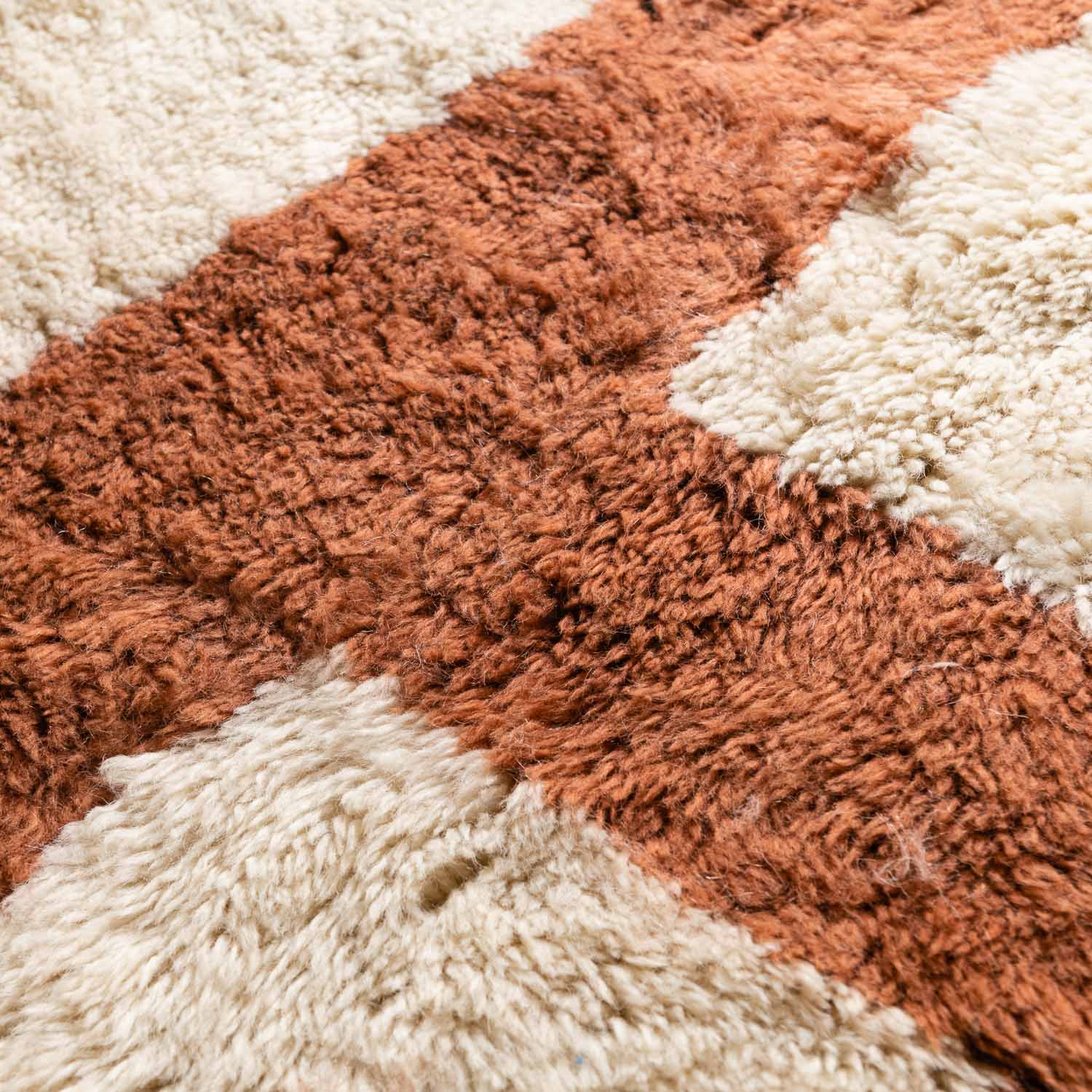 Betreten Sie diesen marokkanischen Teppich, gefertigt aus einer geheimen Mischung aus neuseeländischer und marokkanischer Wolle, die über Generationen verfeinert wurde. Die außergewöhnlich weichen Fasern umschmeicheln Ihre Füße und schenken Ihnen ein sinnliches Erlebnis, das nur echte Handwerkskunst hervorbringen kann.