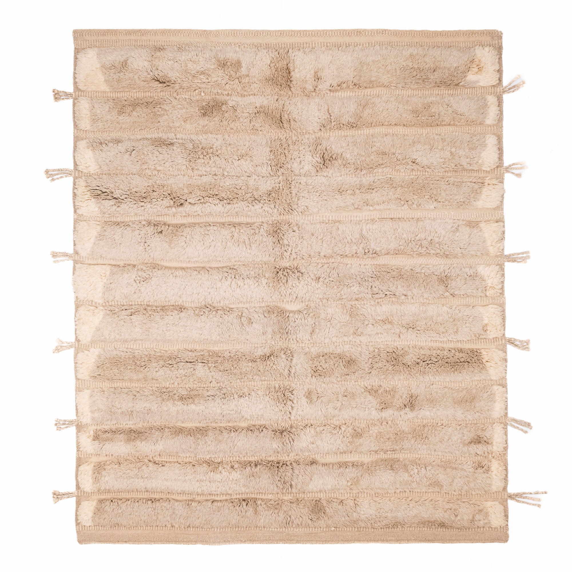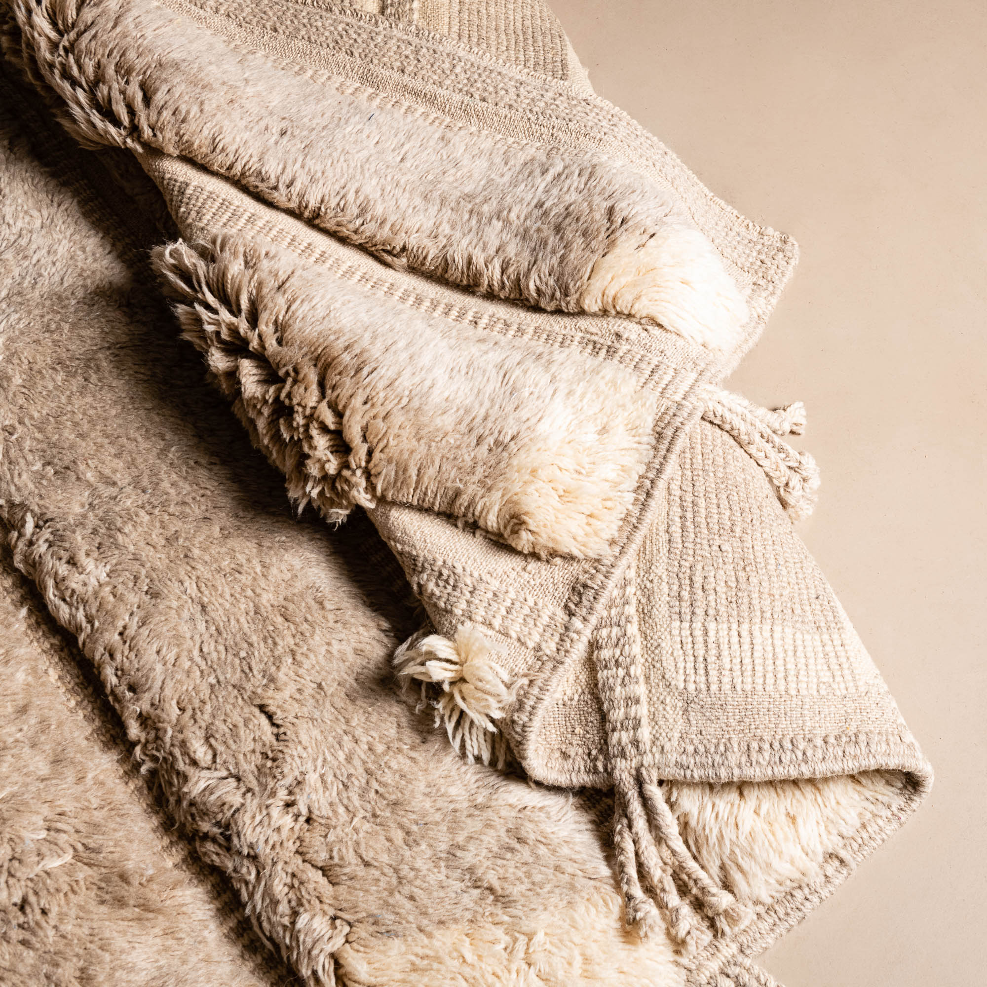 Dieser Teppich wurde von den talentiertesten Kunsthandwerkerinnen der Region Beni Mrirt von Hand gewebt. Sie bewahren das traditionelle Wissen ihres Stammes mit großer Sorgfalt und geben es seit Generationen weiter. Diese uralte Webtechnik, kombiniert mit hochwertiger, aus Australien importierter Wolle, ermöglicht die Herstellung von Teppichen, die zugleich kunstvoll und edel sind. Das Ergebnis ist ein einzigartiges Stück voller kultureller Tiefe, außergewöhnlicher Weichheit und zeitloser Schönheit.