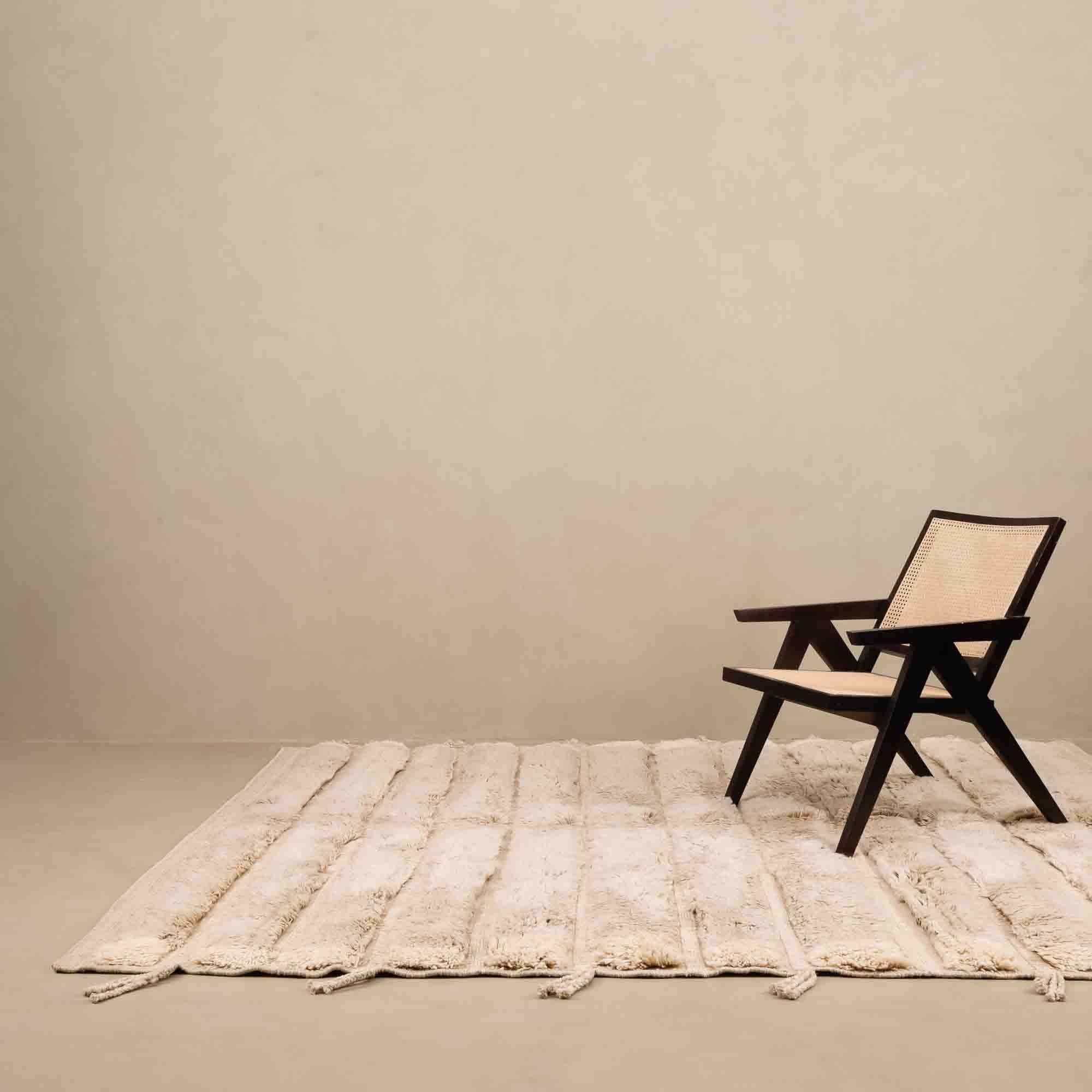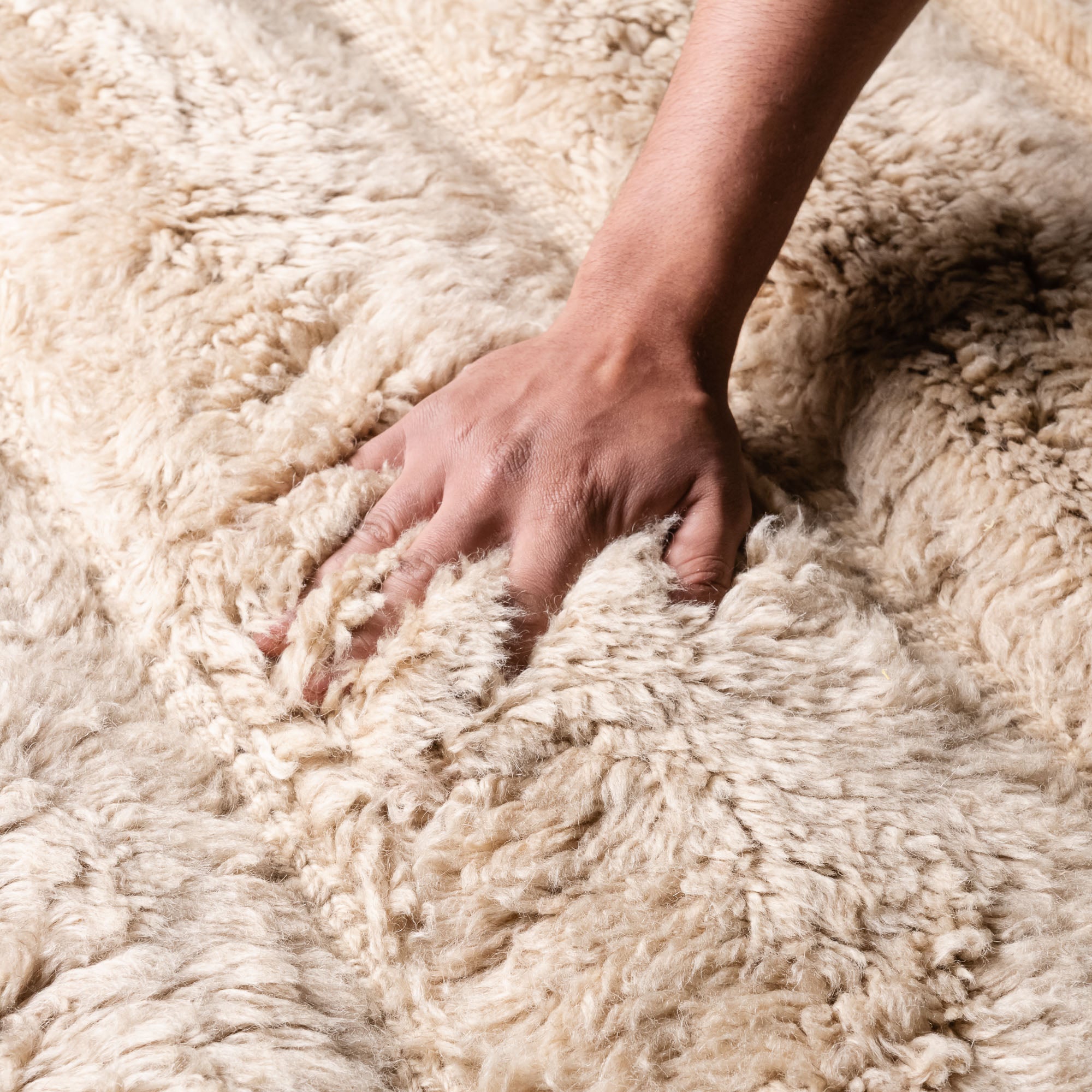Betreten Sie diesen marokkanischen Teppich, gefertigt aus einer geheimen Mischung aus neuseeländischer und marokkanischer Wolle, die über Generationen verfeinert wurde. Die außergewöhnlich weichen Fasern umschmeicheln Ihre Füße und schenken Ihnen ein sinnliches Erlebnis, das nur echte Handwerkskunst hervorbringen kann.