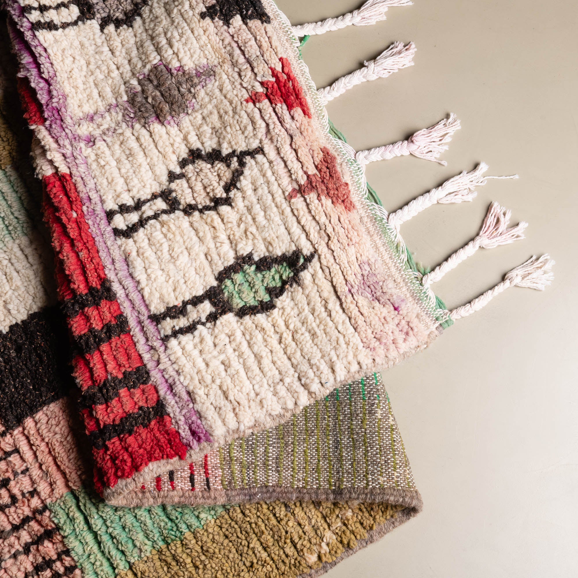 Boujad-Teppiche entstehen aus einem jahrhundertealten Wissen, das von den Frauen des Boujad-Stammes über Generationen weitergegeben wurde. Ihre farbenfrohen Muster sind von der Natur und den traditionellen Vorstellungen der Weberinnen inspiriert.