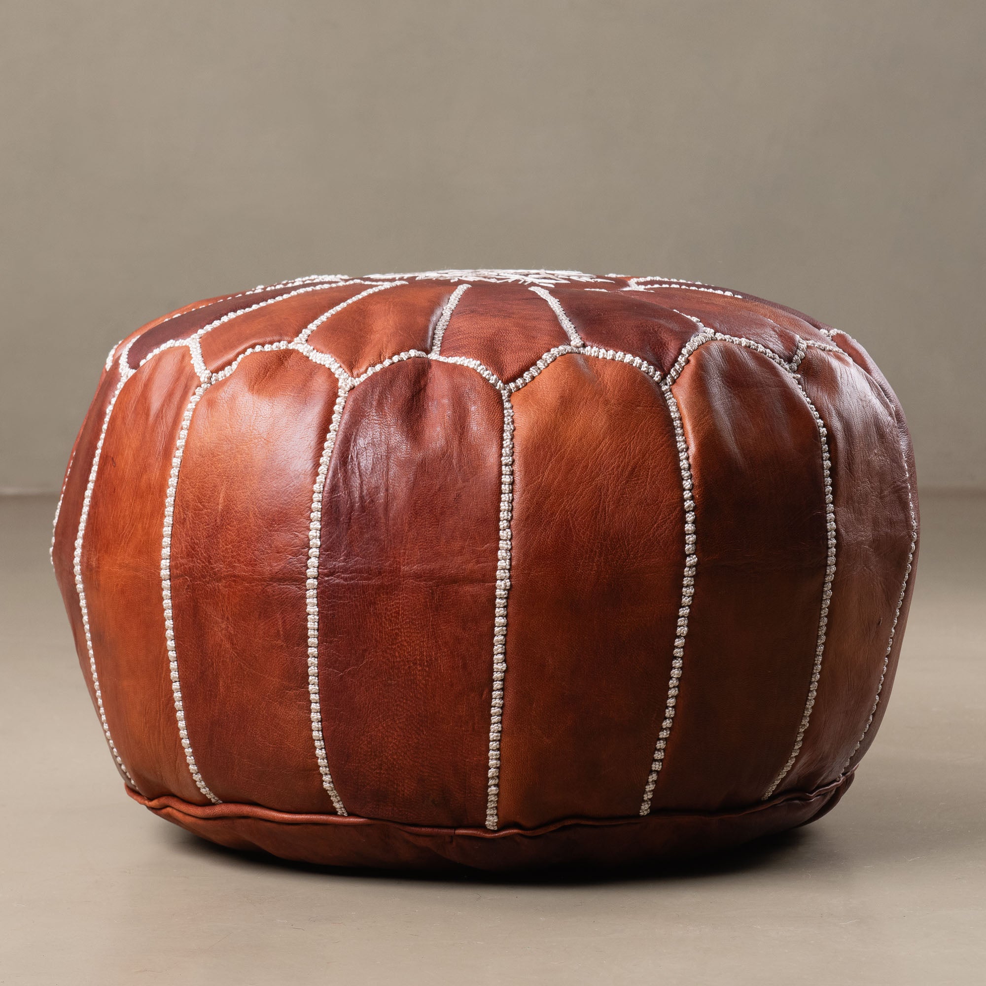 Leather poufs have a long history in Morocco, particularly in Fes, where skilled artisans have been crafting them for centuries. The process of dyeing the leather involves using natural dyes such as saffron and indigo, which give the leather its vibrant hues. The leather is then cut, stitched, and embroidered by hand, resulting in a beautiful and unique product.