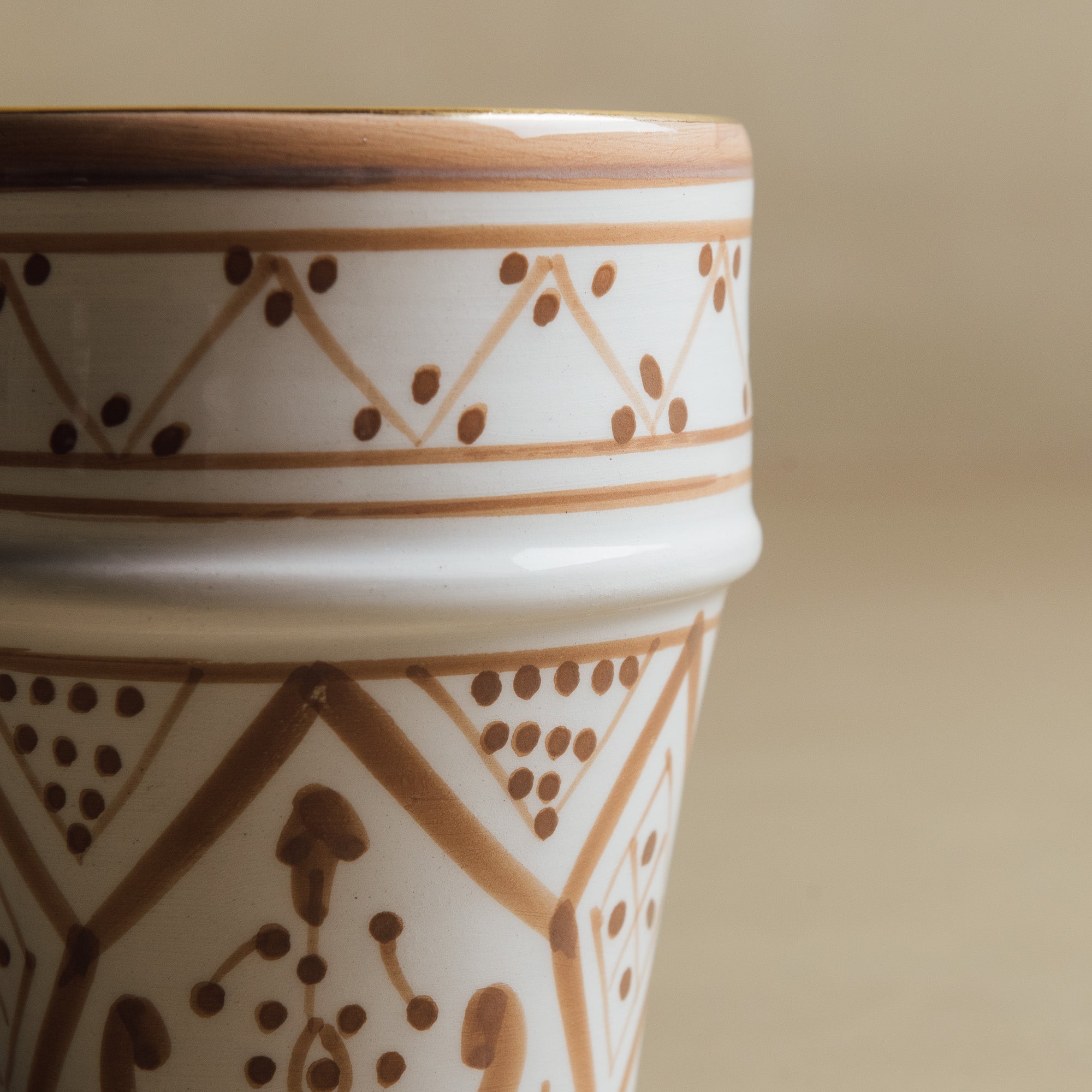 Add a touch of Moroccan elegance to your everyday moments with the Fez Sand Cup. Handcrafted by skilled Moroccan artisans, this cup features a minimalist design, highlighted by luxurious 12-carat gold accents for a refined, timeless look. Perfect for coffee, tea, or any drink of choice, it brings together authentic craftsmanship and modern sophistication.