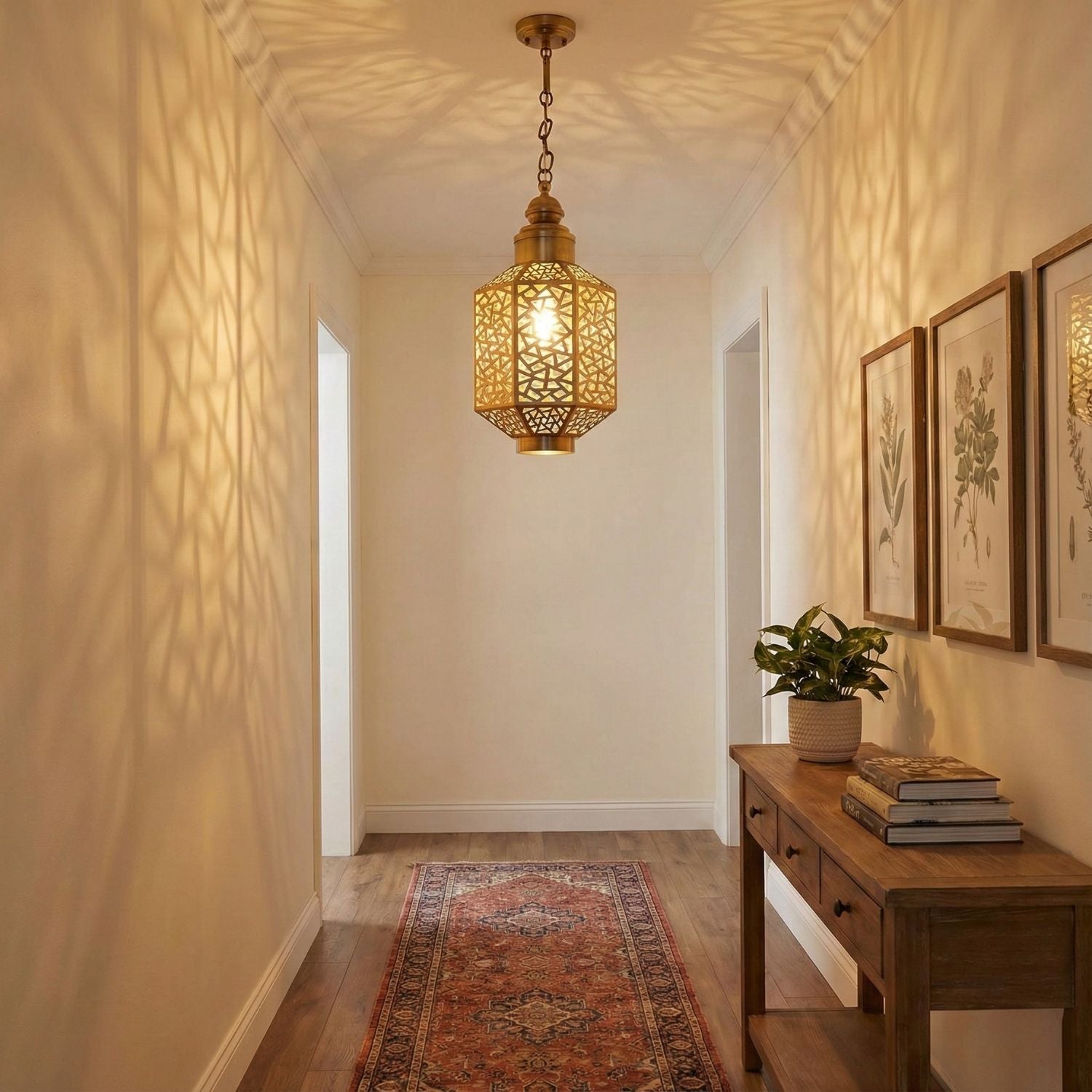 Moroccan brass pendant lights are handcrafted through an intricate process. Patterned sheets of brass are hand-hammered for depth, polished for a rich finish, and assembled with electrical wiring, often enhanced by colored glass or beads. The result is a light source that beautifully represents Morocco's cultural heritage.