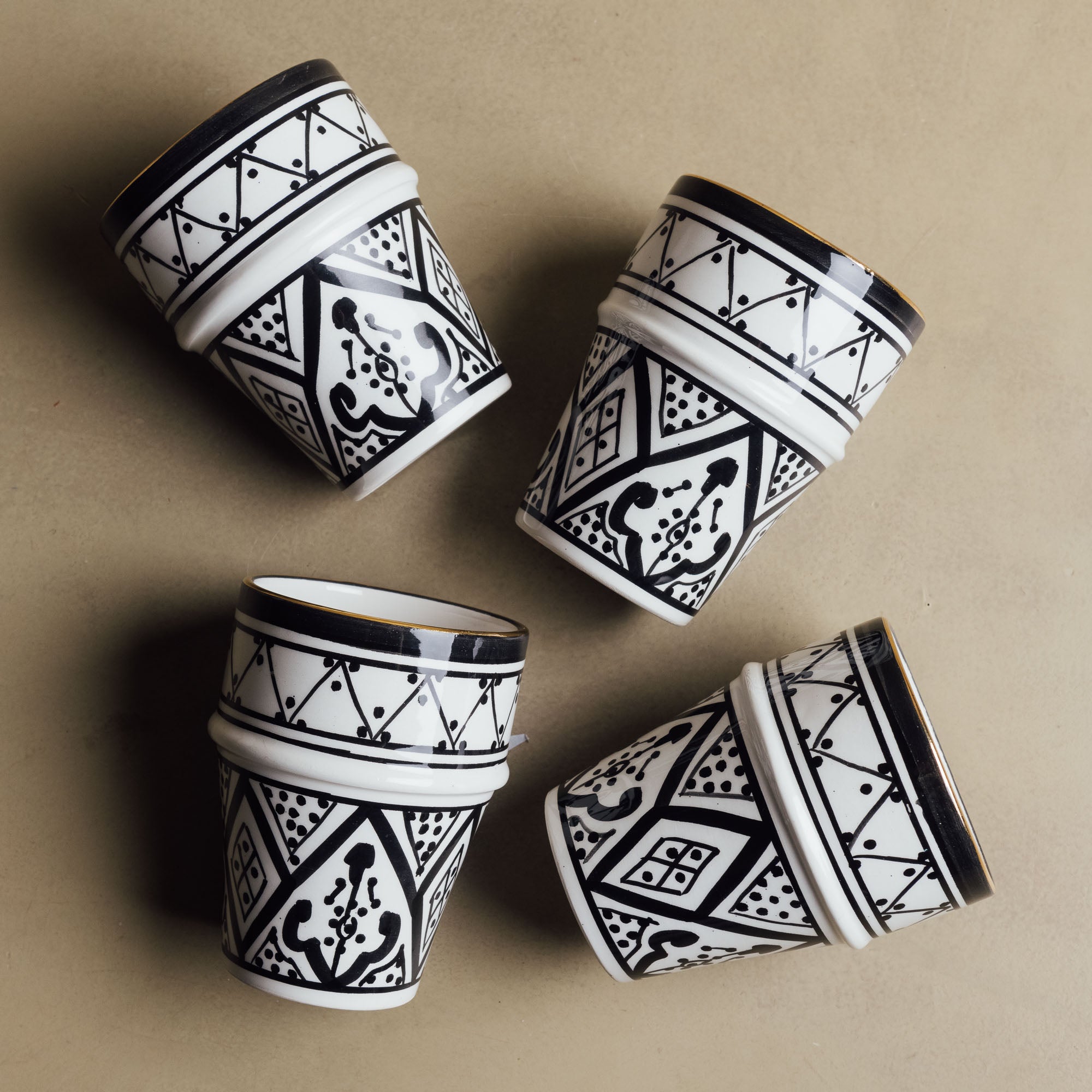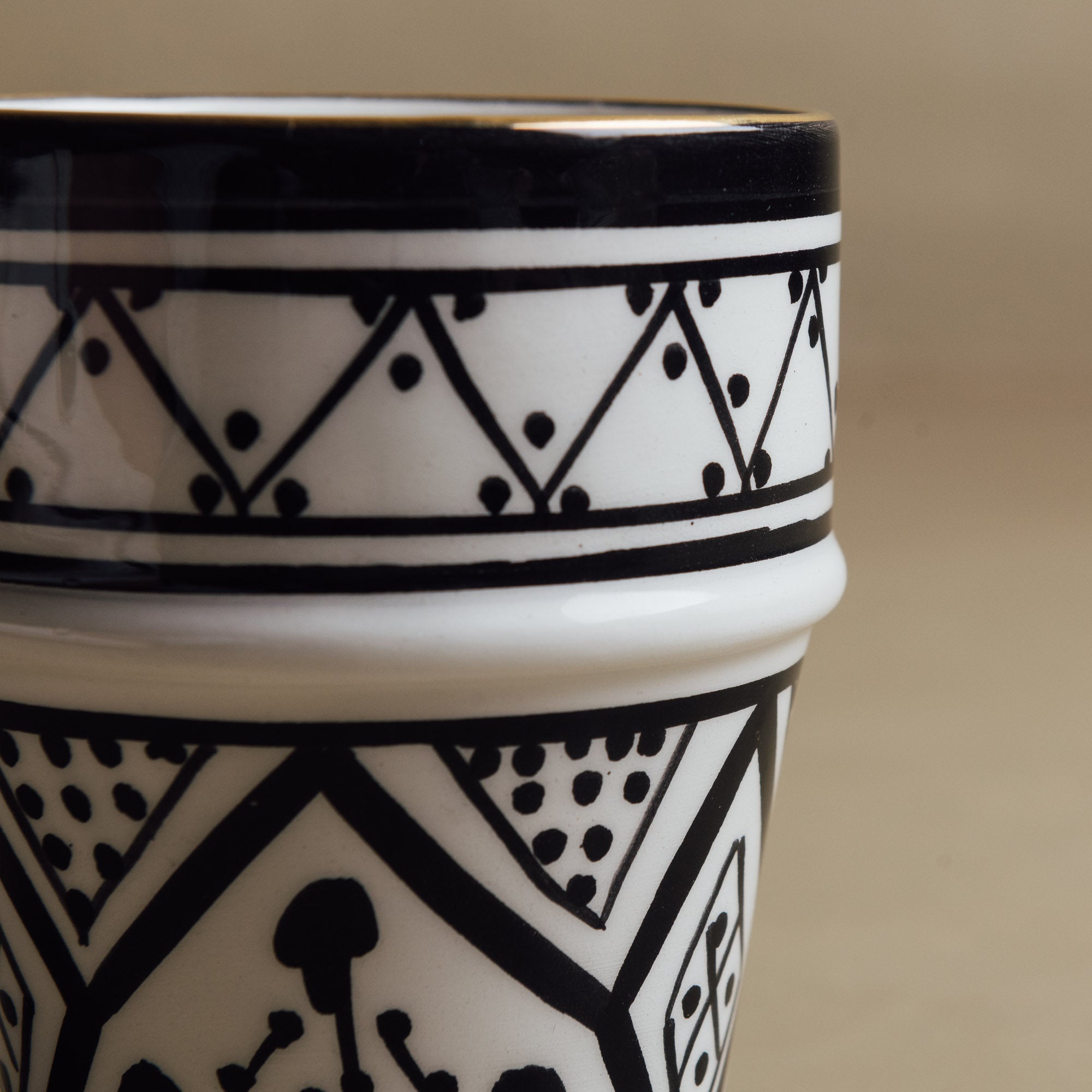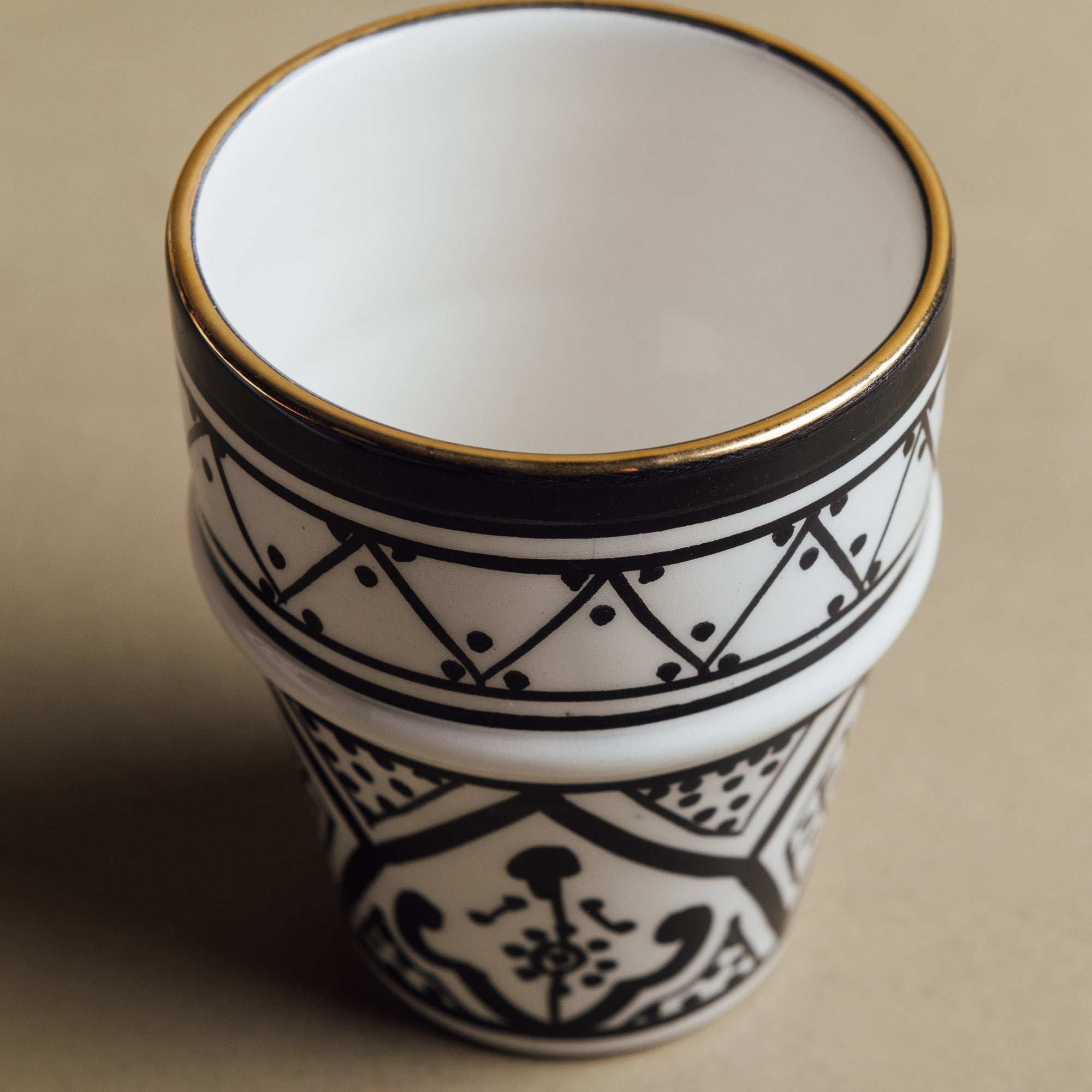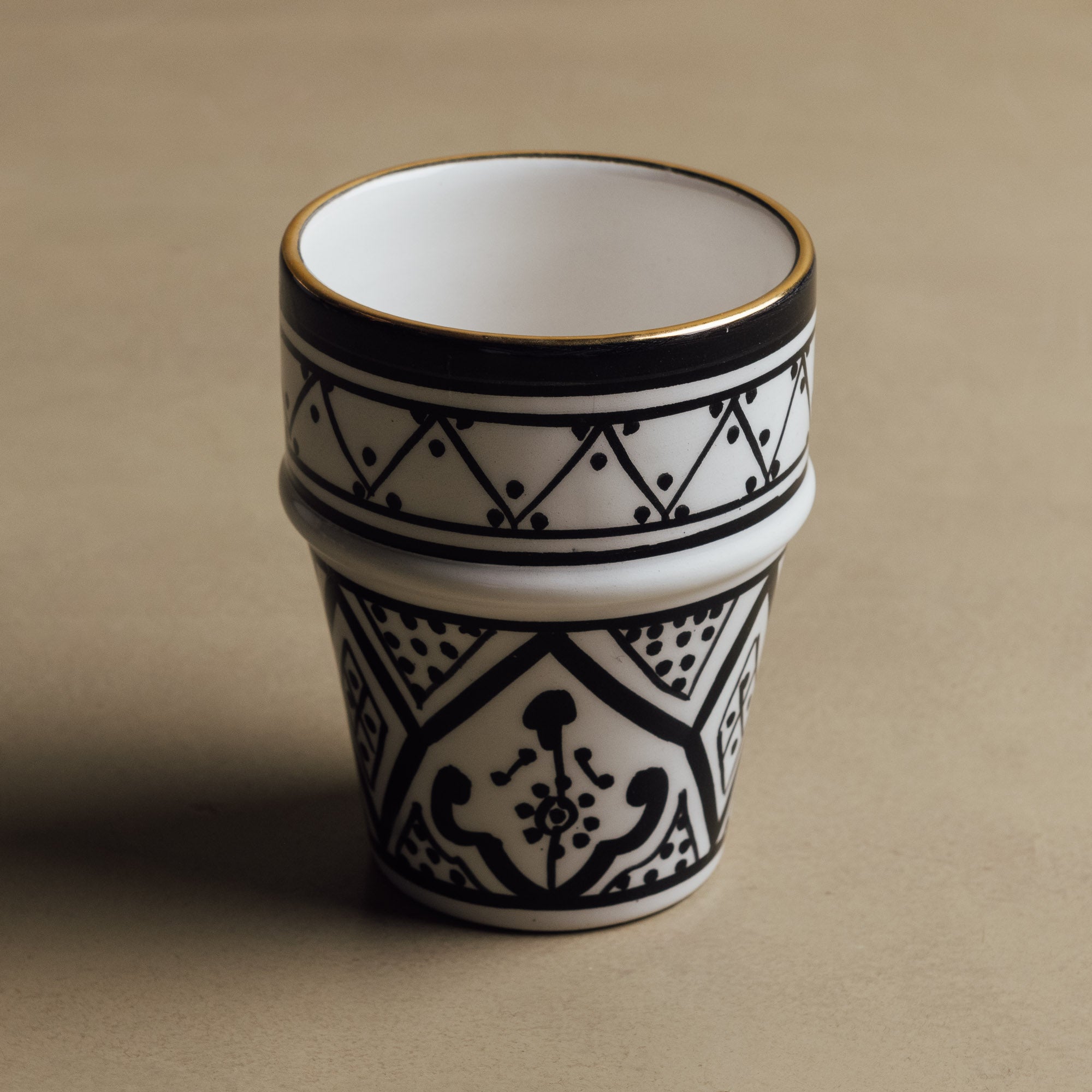 Add a touch of Moroccan elegance to your everyday moments with the Fez Noir Cup. Handcrafted by skilled Moroccan artisans, this cup features a minimalist design, highlighted by luxurious 12-carat gold accents for a refined, timeless look. Perfect for coffee, tea, or any drink of choice, it brings together authentic craftsmanship and modern sophistication.